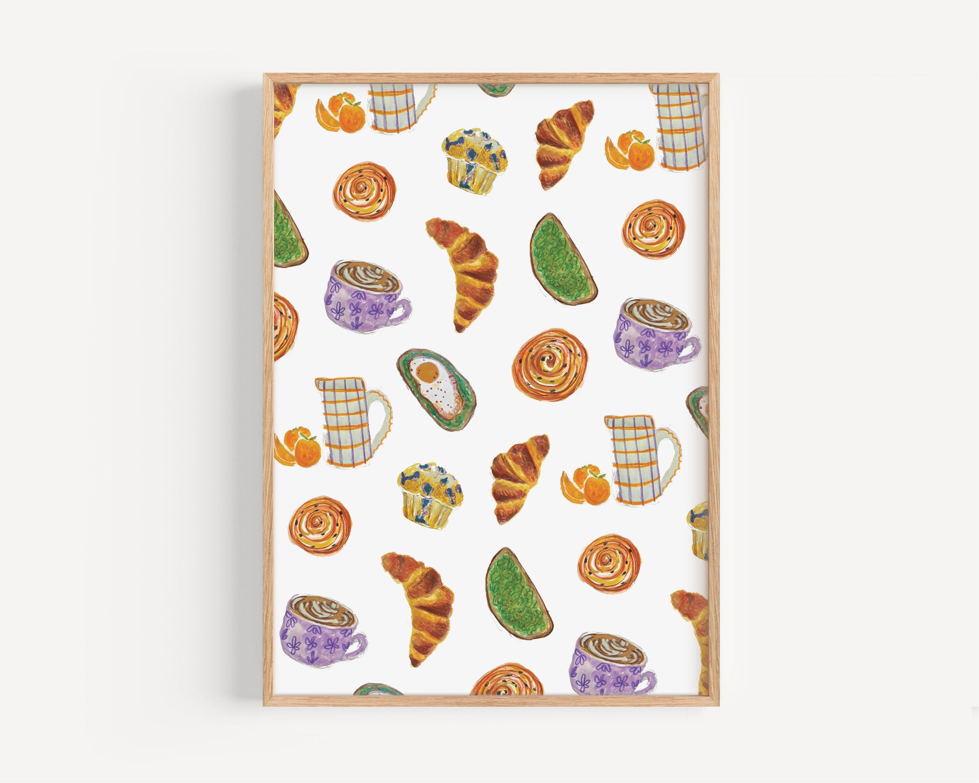 A printed reproduction of one of my original illustrations featuring a variety of different breakfast and brunch items. The original illustration was made using mixed media such as gouache paint, oil pastels, coloured pencils and posca pens.