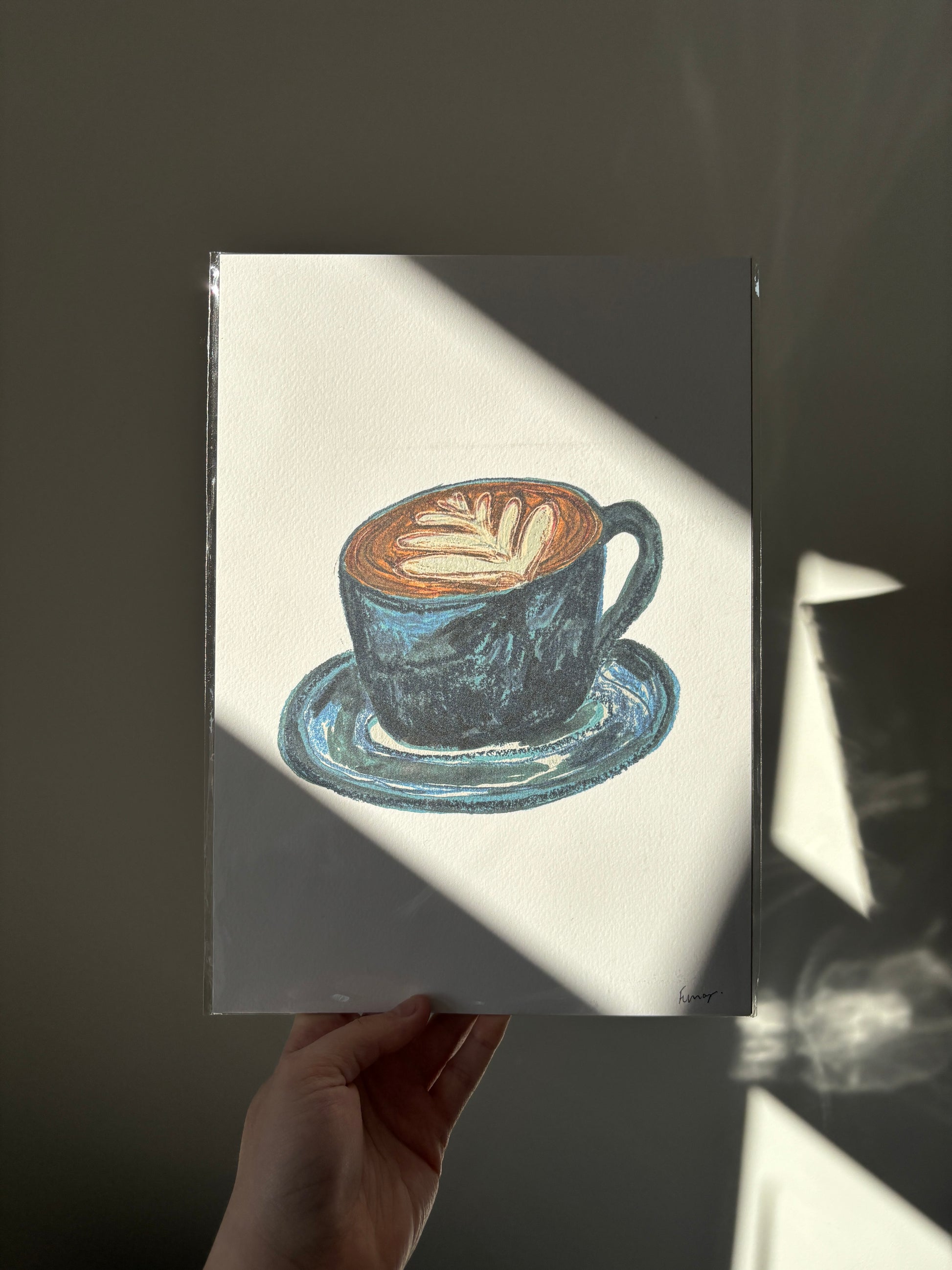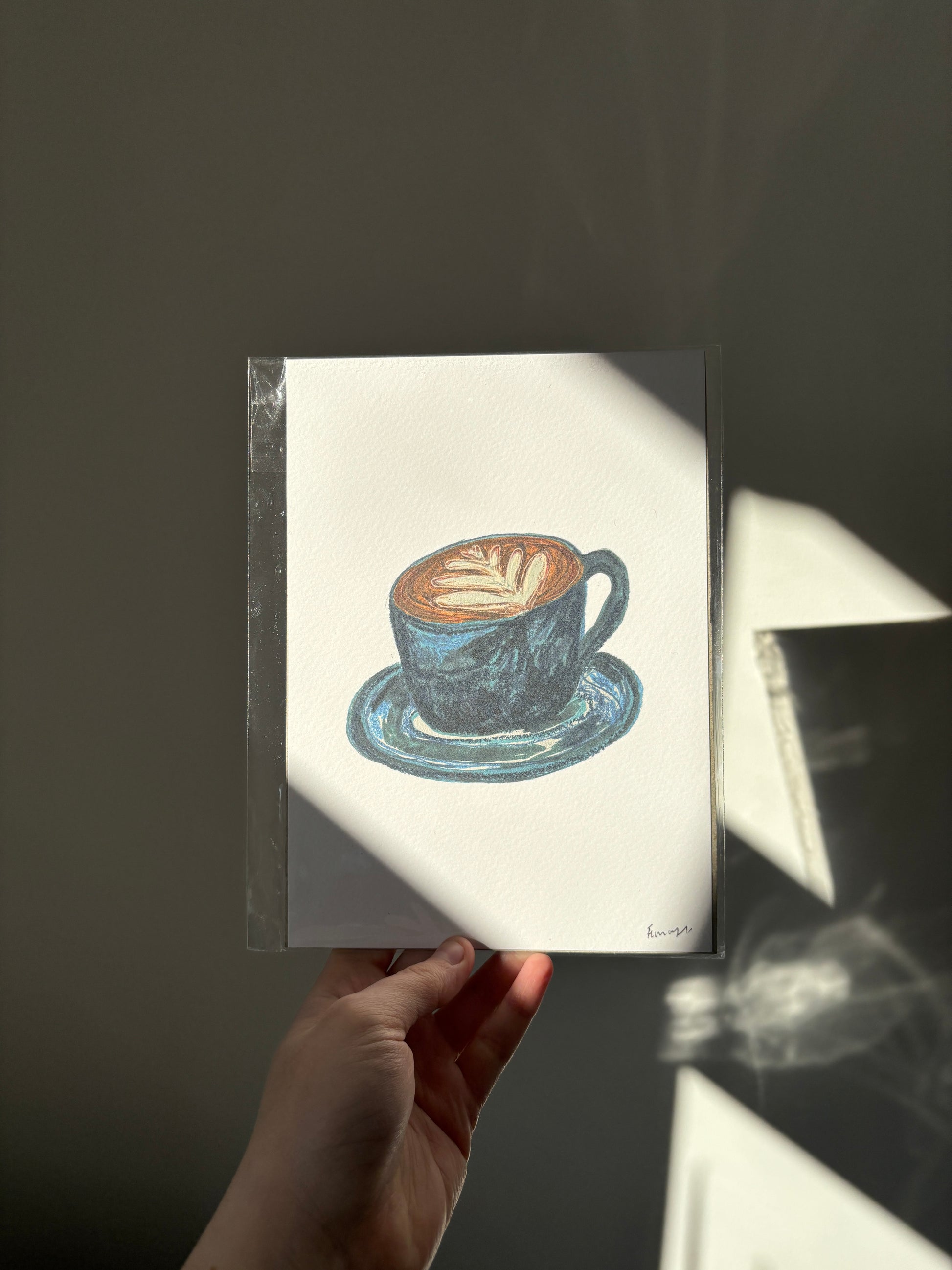 A printed reproduction of one of my original illustrations featuring a cup of coffee.