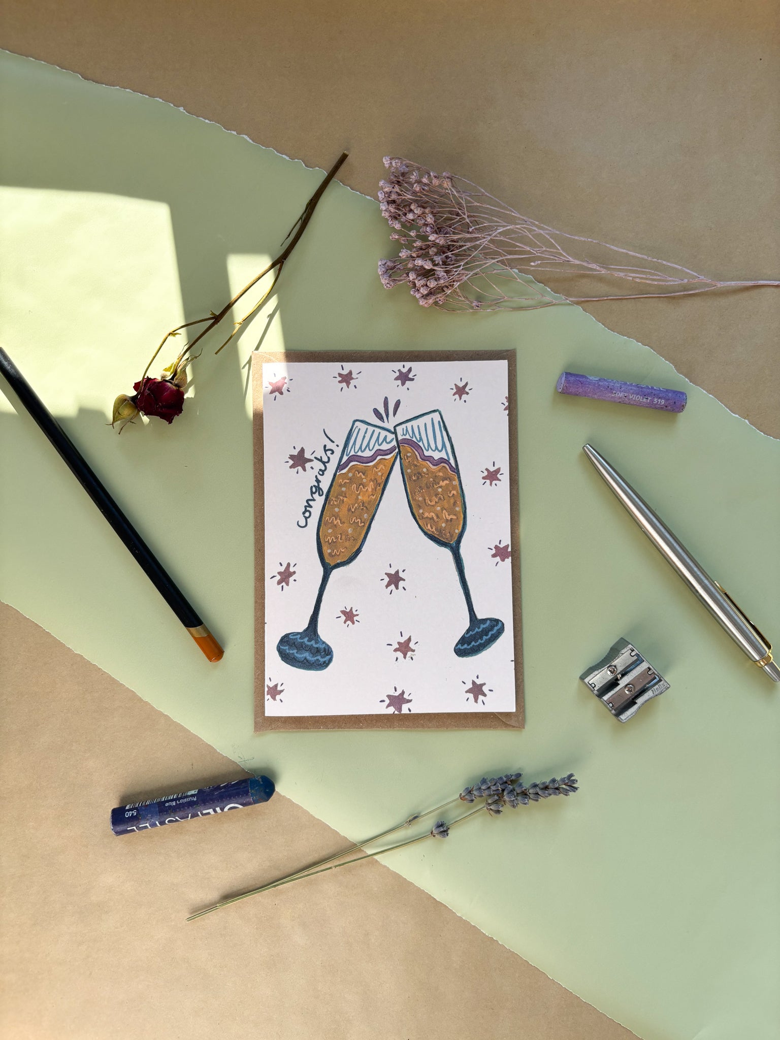 I designed the illustration for this card using mixed media such as gouache paint, pencils and oil pastels.