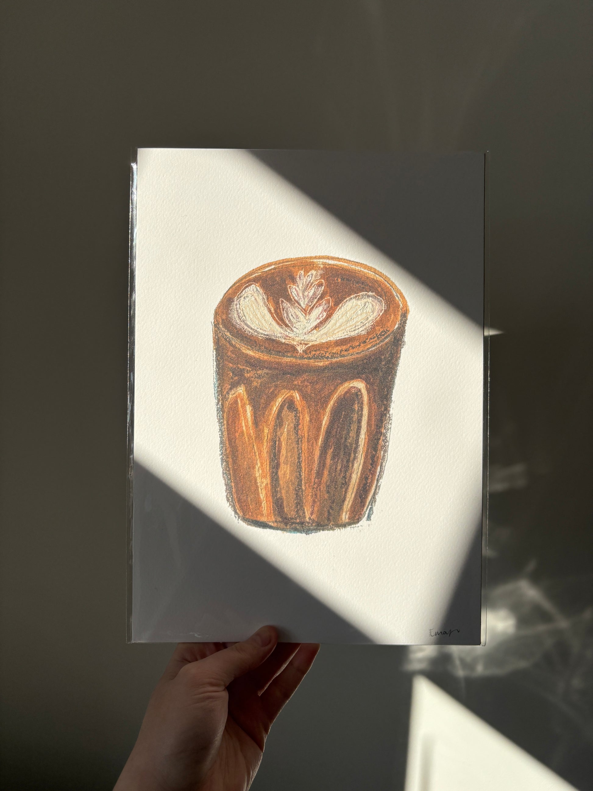 A printed reproduction of one of my original illustrations featuring a Cortado coffee.