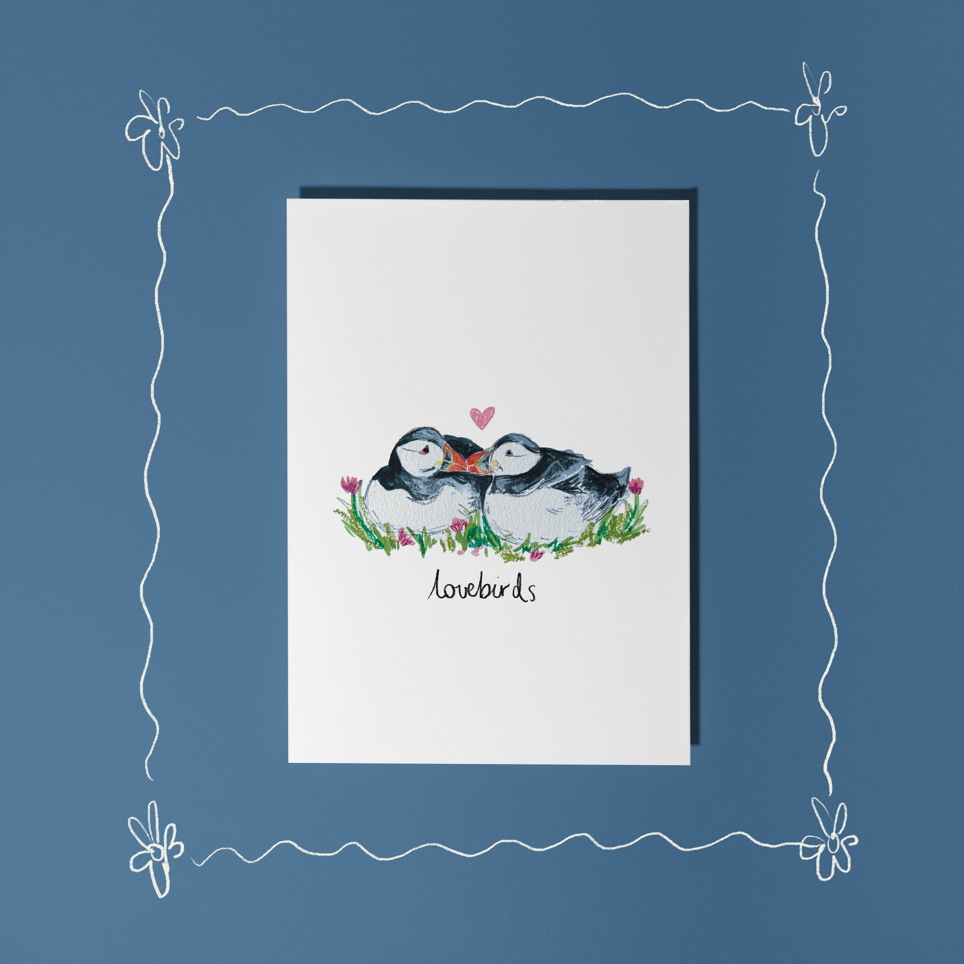 An Anniversary/ Valentine's/ Love card featuring an illustration of two puffins and the phrase 'lovebirds'.
