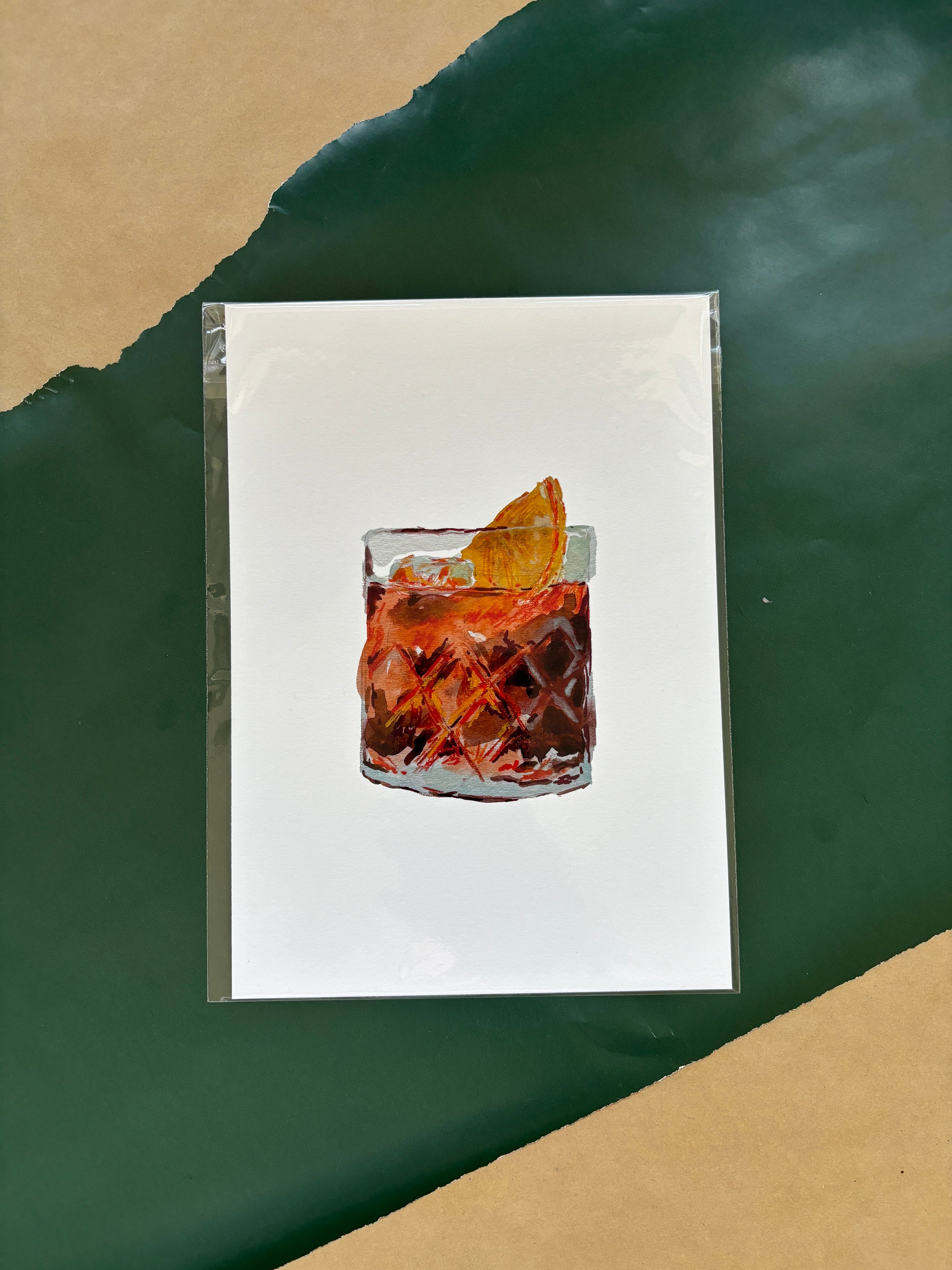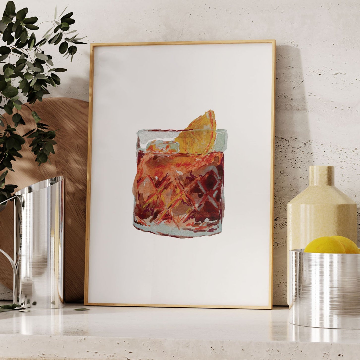 A printed reproduction of one of my original illustrations featuring a Negroni Cocktail. The original illustration was made using mixed media such as gouache paint, oil pastels, coloured pencils and posca pens.