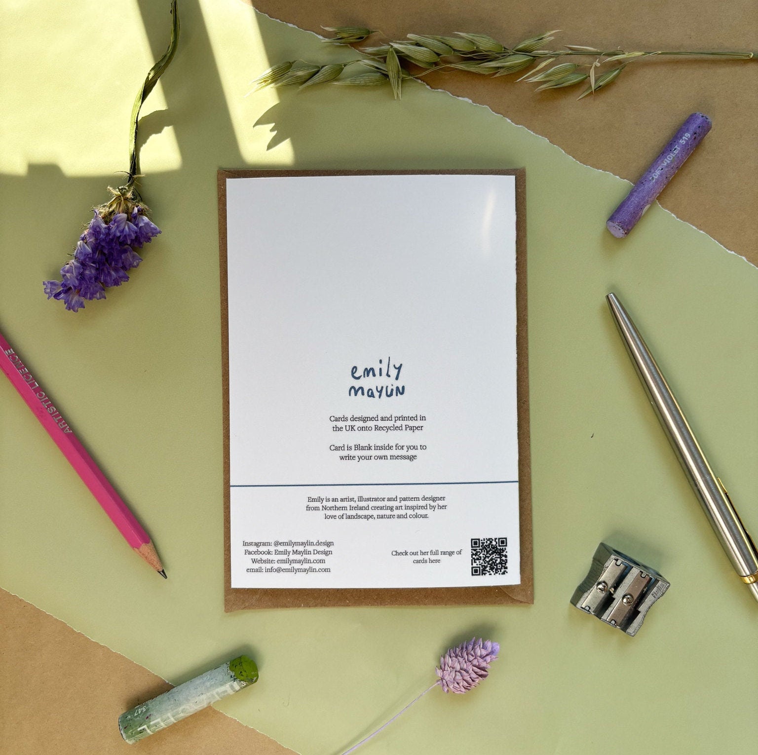 I designed the illustration for this card using mixed media such as gouache paint, pencils and oil pastels with a few extra details added using Procreate.