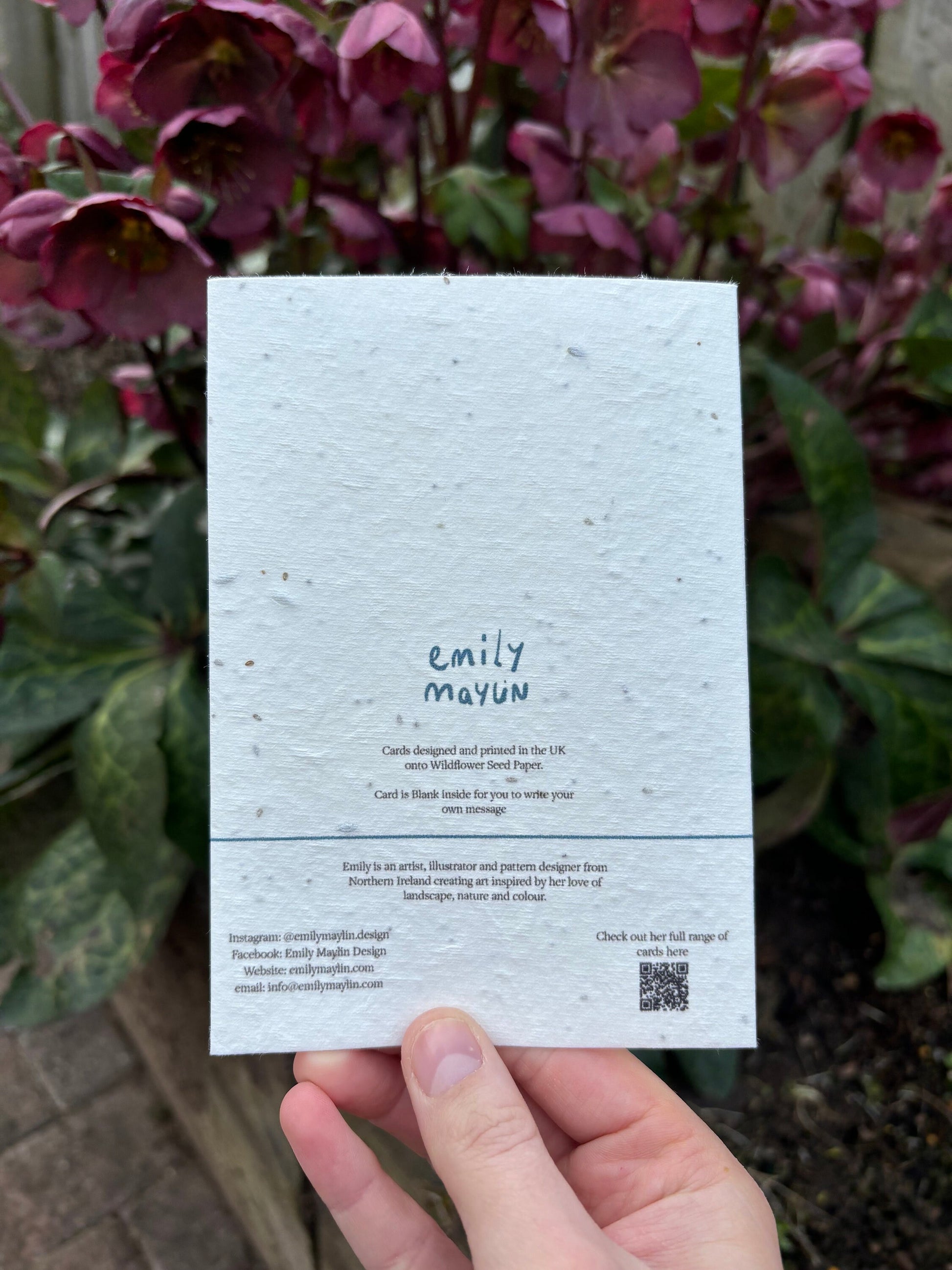 The card is printed onto 200gsm seed paper and so once you are finished with it, the card can be planted and will turn into beautiful flowers. This card is made with Wildflower seeds. (please note due to the nature of the paper it is quite textured and contains visible flecks due to the seeds.)