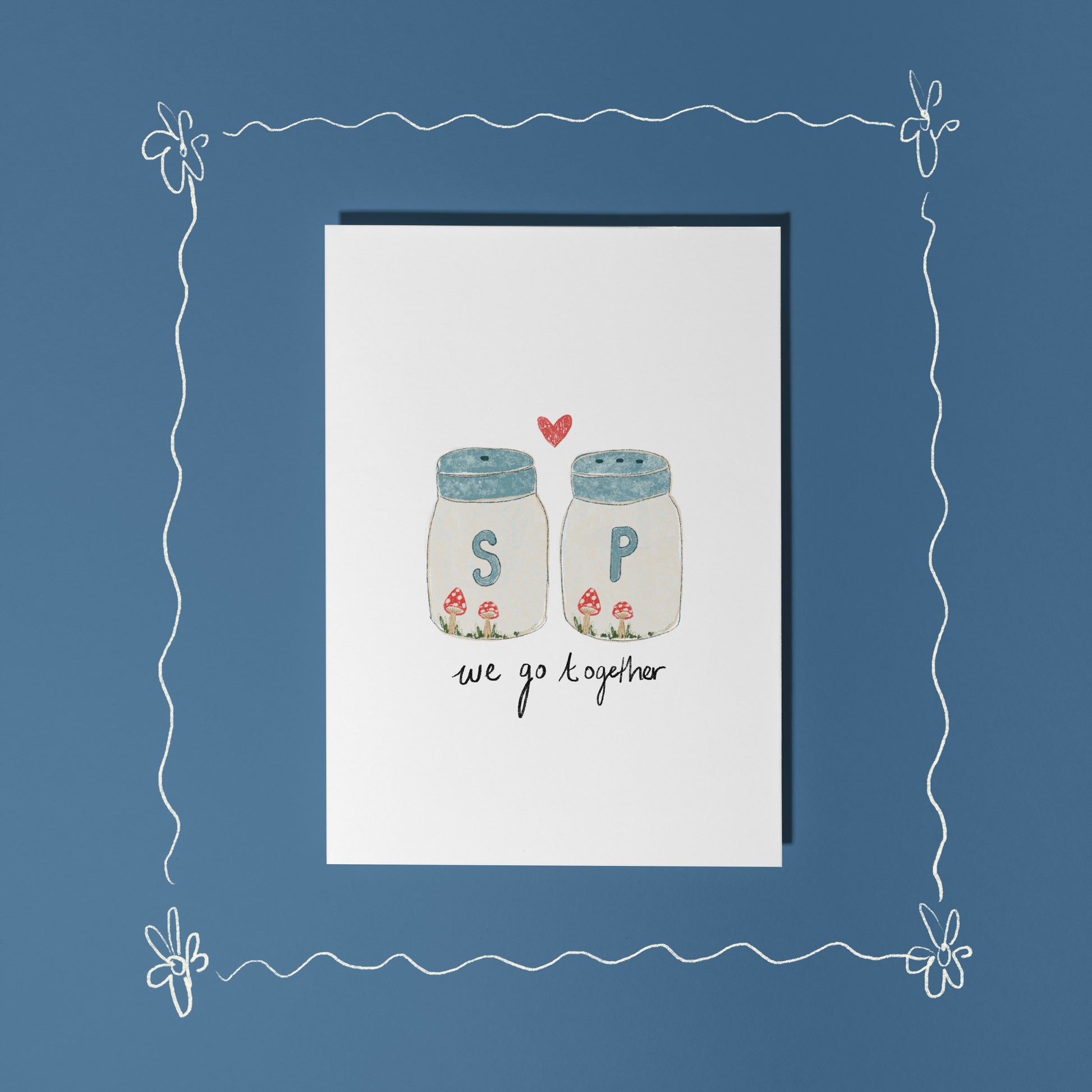 An Anniversary/ Valentine's/ Love card featuring an illustration of a pair of salt and pepper shakers and the phrase 'we go together'.
